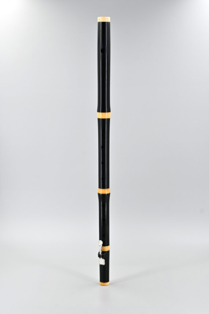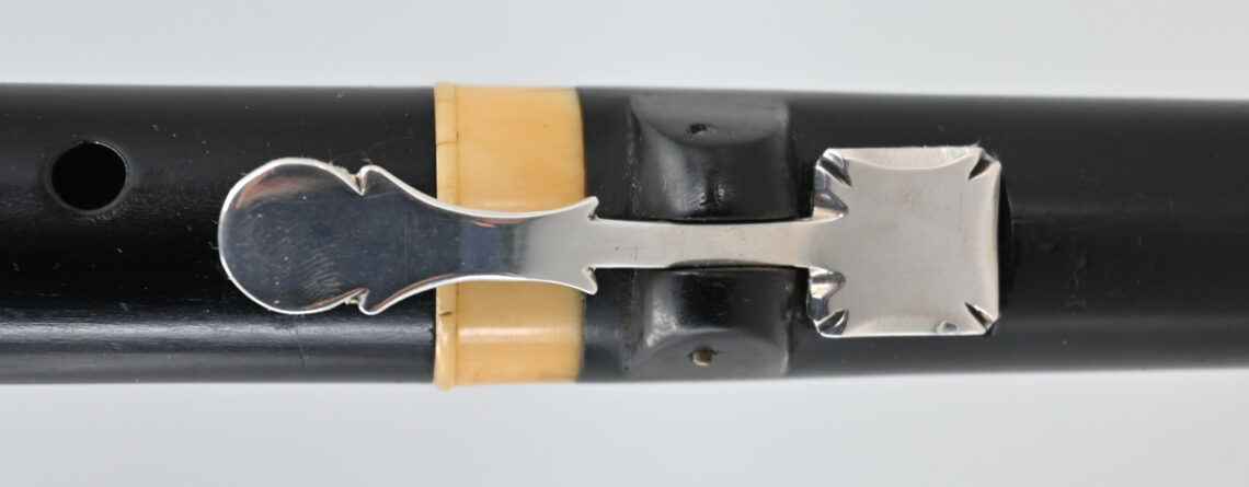 It is made of the darkest, sleek black ebony adorned with exquisitely carved ivory ferrules and topped with an ivory cap. The ivory at the lower end of the foot joint is actually formed to cover over the wood and looks amazing. The key is breathtakingly beautiful and the silver gleams. It is held in a block which was carved away from the ebony.