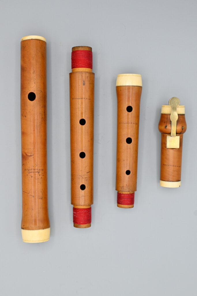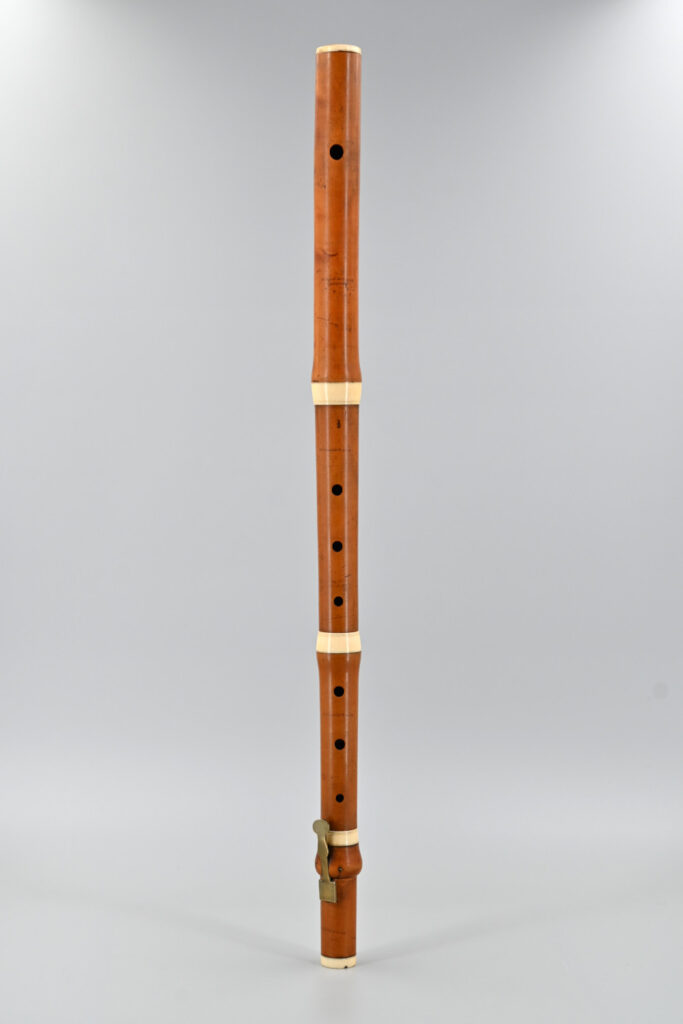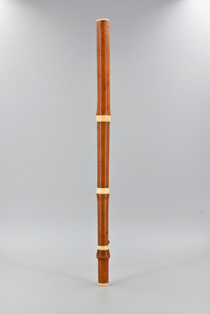 This four-part GOULDING & CO boxwood flute has a fantastic appearance. The honey-coloured wood is truly beautiful. It features ivory rings and a single brass key. The embouchure is slightly oval – measuring 8.70 x 9.65 mm. It is likely that it was created at the beginning of the 1800s. This is supported by the wide ivory rings, the design of the key and its pitch of a=435 Hz.