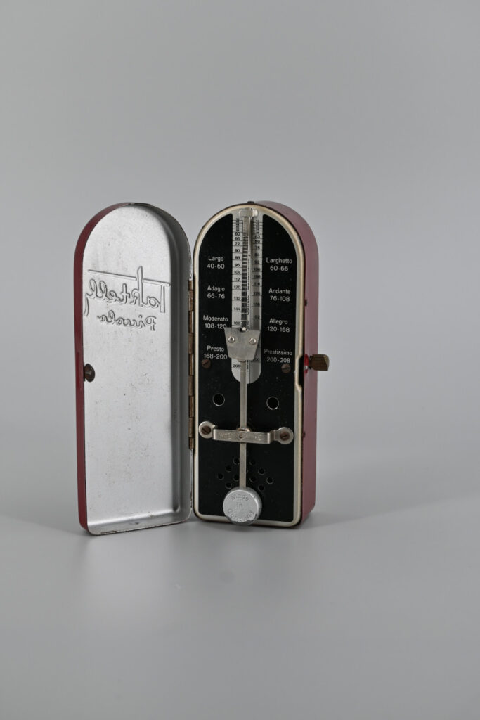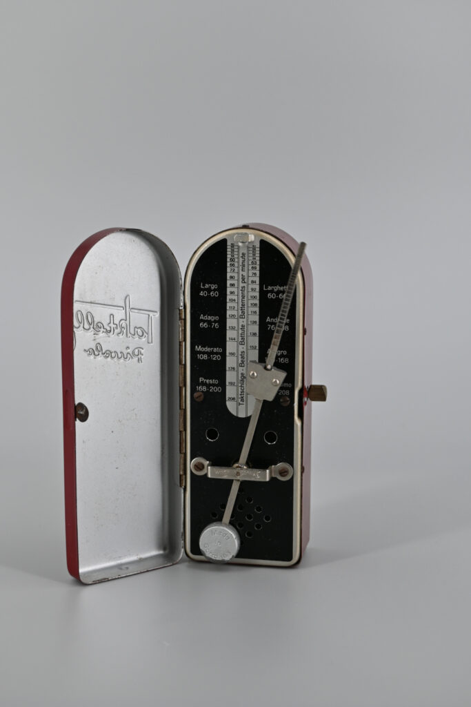 This is a wonderful metal-encased portable metronome produced by the company WITTNER in Isny im Allgäu, Baden-Württemberg. This famous company was founded by Gustav Wittner in 1895 and specialised in manufacturing metronomes. Gustav’s son, Rudolf continued to expand the business, making Maelzel as well as Taktell® metronomes. The firm was extremely successful and had the widest range of metronomes in the world. The products were renowned for their amazing quality. Now the third and fourth generation are at the helm – Horst Wittner & Sabrina Wittner, producing other musical accessories too.