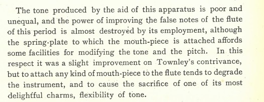 Rockstro was not at all impressed with either invention since the tone it produced was “poor and unequal”.
