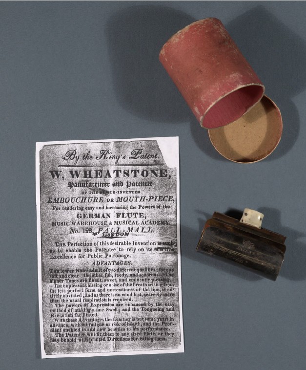 There is another example of the William Wheatstone mouth-piece (Flute Mouthpiece, DCM 1340) held in the Library of Congress Dayton C. Miller collection. It mentions that the mouth-piece serial number 631 once belonged to the flutist Pratten. William Wheatstone praises his own invention saying in his leaflet that “the Learner is put some years in advance, without fatigue or risk of health, and the Proficient enabled to add new beauties to his performance.”