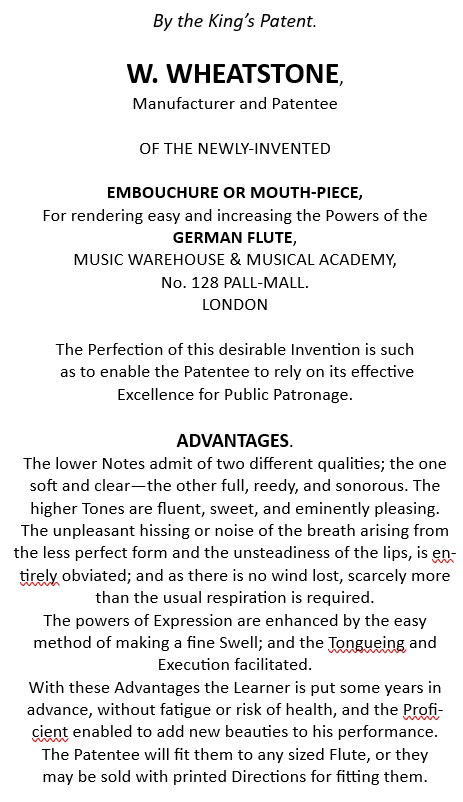 We can date the invention of the Wheatstone embouchure to the beginning of the 1800s. It is already mentioned in the above published music in 1817. There’s also an entry (534) about it in Rockstro’s “A treatise on the construction, the history and the practice of the flute”.