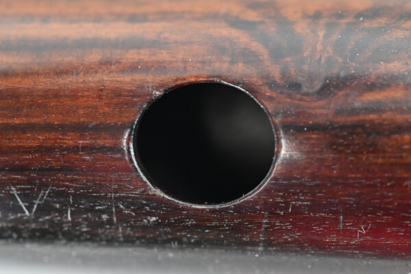 This flute comes with its original, leather-bound case. In terms of condition, the flute underwent some previous restoration, including new pads. It plays at between a=435 Hz and a=438 Hz with a wonderful timbre. It sounds dark, round, soft… yet powerful.