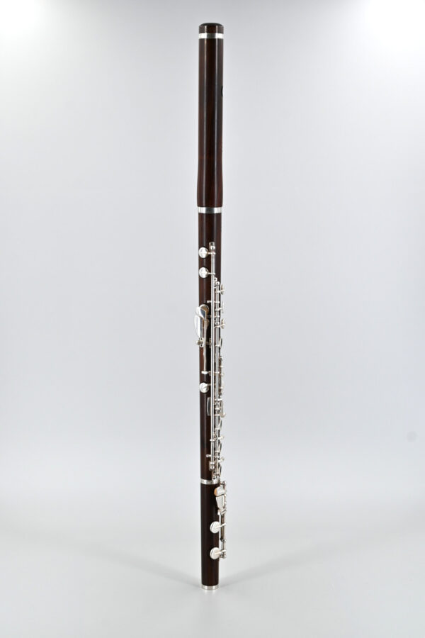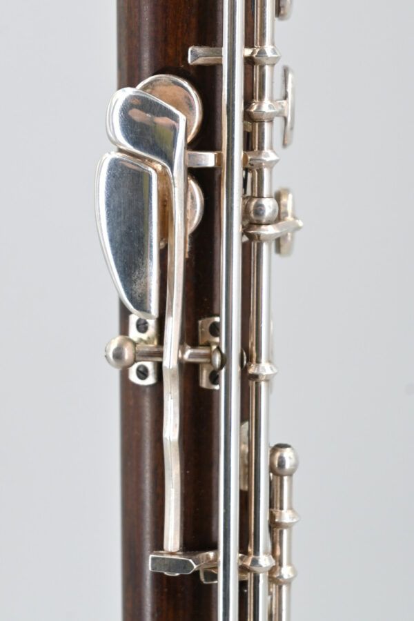 It is really one of a kind – custom made rather than part of a series. The cocuswood is beautiful and the keywork is made from solid silver. We can immediately see that there is no rib at all. The posts to hold the mechanism are held on little plates that are screwed into the wood. It features an offset G to make it easier for the left-hand ring finger to reach the G. Since it is not inline, a separate axis for the front G-ring and G-sharp key is necessary.
