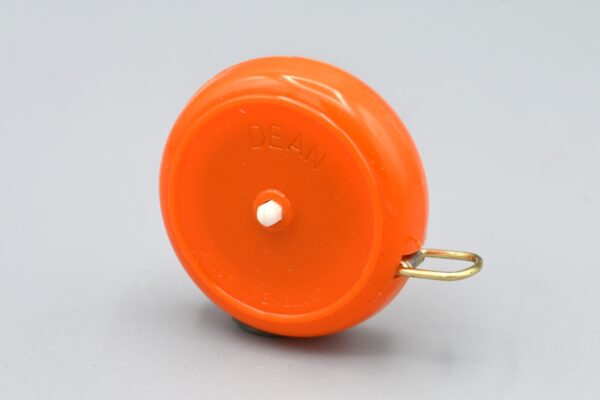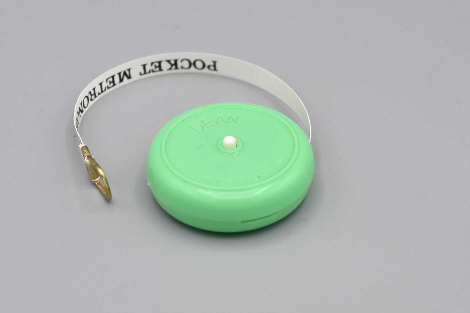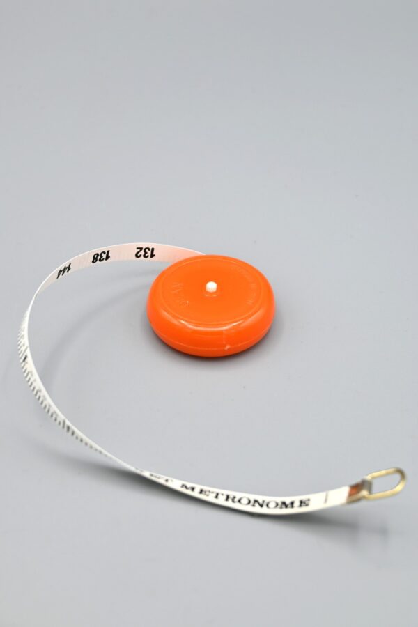 This handy item doubles as a tape measure and pocket metronome. The plastic container acts as the weight. Printed on one side of the tape is the scale from 60 to 160 and “POCKET METRONOME”. On the other side are inches and “DEAN”. The case diameter is 40 mm. The tape rewinds on a spring, activated by pressing the central button.