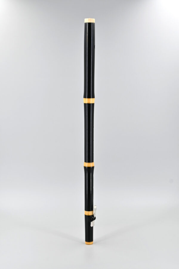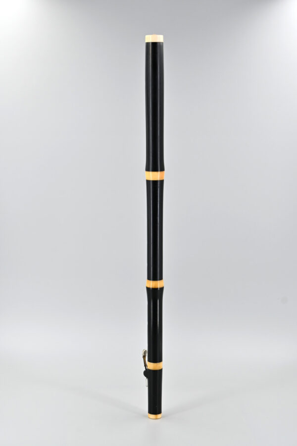 It is made of the darkest, sleek black ebony adorned with exquisitely carved ivory ferrules and topped with an ivory cap. The ivory at the lower end of the foot joint is actually formed to cover over the wood and looks amazing. The key is breathtakingly beautiful and the silver gleams. It is held in a block which was carved away from the ebony.