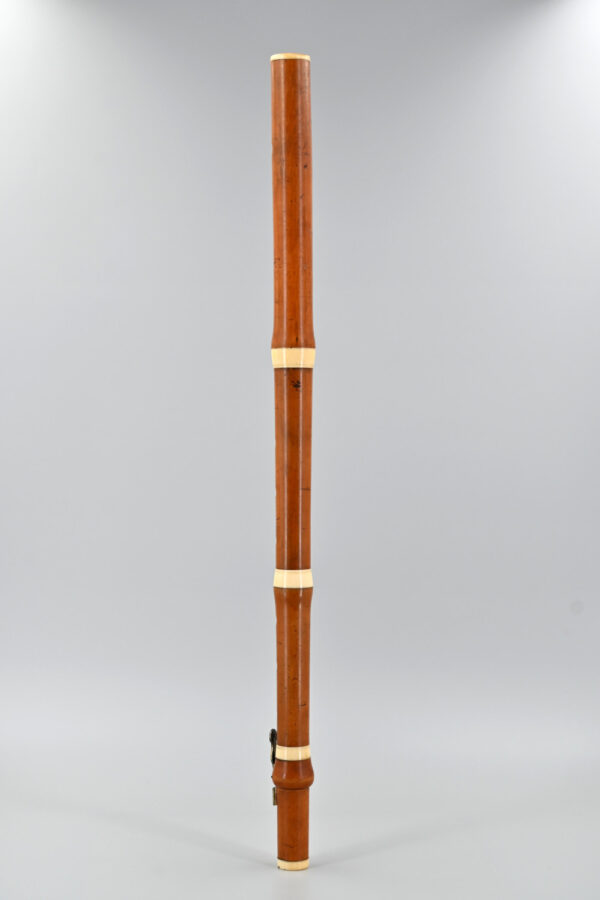 This four-part GOULDING & CO boxwood flute has a fantastic appearance. The honey-coloured wood is truly beautiful. It features ivory rings and a single brass key. The embouchure is slightly oval – measuring 8.70 x 9.65 mm. It is likely that it was created at the beginning of the 1800s. This is supported by the wide ivory rings, the design of the key and its pitch of a=435 Hz.
