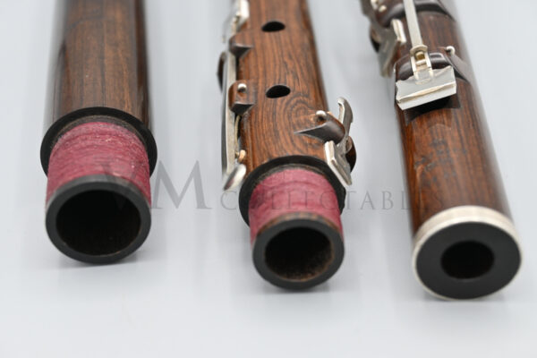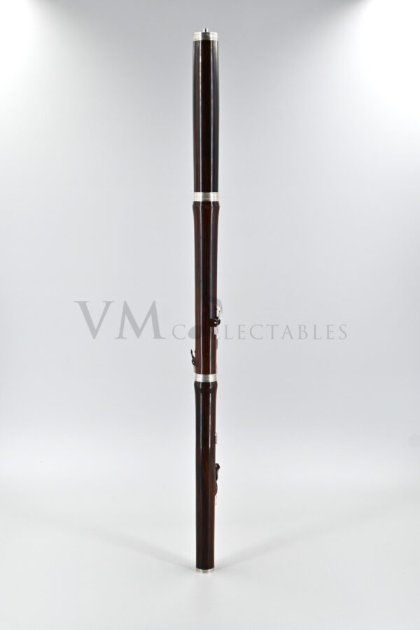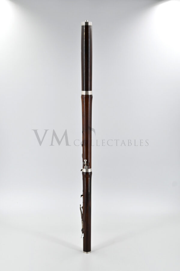 show more Monzani’s flutes are known for several unique characteristics and this one is no exception. The flute has a reverse tenon at the head joint. The keys flaps are also quite fascinating. They are flat with a fixed protruding threaded screw. Over this, a perforated flat pad is incorporated, which is fixed in place by a silver button (patent 1807). The word PATENT is stamped on the wood. These pads were relatively quieter than the pewter variants and were meant to improve the instrument’s sound quality. Plus, it also incorporates the combined lower middle and foot joint. The flute is stamped on all parts with the maker’s mark. It was made in 1811 and has the serial number 186. It is crafted in expertly selected cocuswood – with a wonderful grain. It has a C-sharp foot joint. The six solid silver keys have the typical Monzani crown stamps. The specially designed silver rings simply gleam. The embouchure is masterfully cut with the highest precision measuring 8.8 x 9.7 mm. This Monzani flute was fully restored. It was fully cleaned. The original silver rings were loose and were refitted. The flute was equipped with a new head cork, new pads (silicon) and windings. Some of the original pads and tenon thread were kept to give to the flute’s future owner. This instrument really deserved a new case to keep it safe for many years to come. A handcrafted walnut case was created specifically for this flute. The flute plays incredibly well at around a=438 Hz to a=440 Hz. Its tone is dark and it oozes character. With its superb intonation and effortless playability in every register, this Monzani flute is truly extraordinary. It is a remarkable testament to the exceptionally high quality of English flute craftsmanship from over two centuries ago. show less