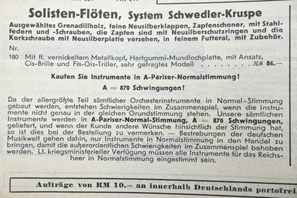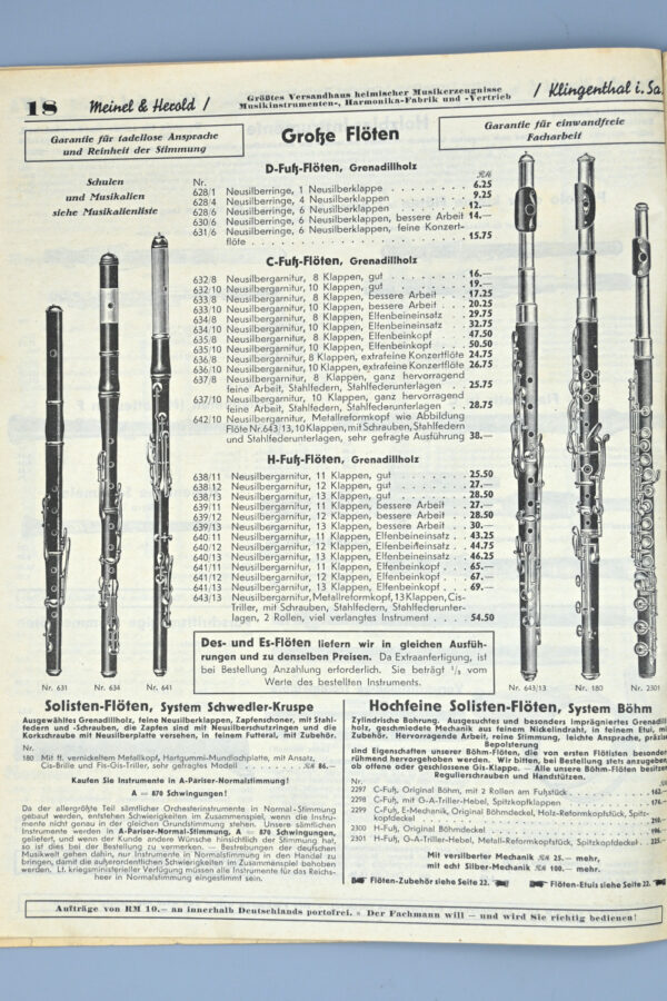 This System Schwedler-Kruspe flute featured in the MEINEL & HEROLD product catalogues. Meinel & Herold, established in 1893 in Klingenthal, Germany, started as an accordion factory, but over time, it evolved into one of the key trading companies in the area. The company was extremely successful, focussing solely on mail order for private customers. These private customers included musicians, instrument teachers, orchestras, and more, both at home and abroad. It had a diverse selection of products that were produced in the Saxon-West Bohemian region. In the 1930s, it started production of its own brass instruments, guitars and percussion instruments.