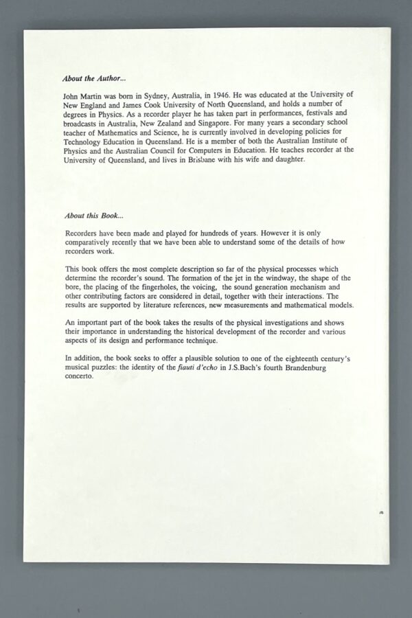 This book was published by Moeck in 1994. In a nutshell, its main focus is on explaining the physical processes responsible for the various tonal characteristics of the recorder. With 112 pages of English text and diagrams, you’ll find everything you ever wanted to know about this topic and beyond.
